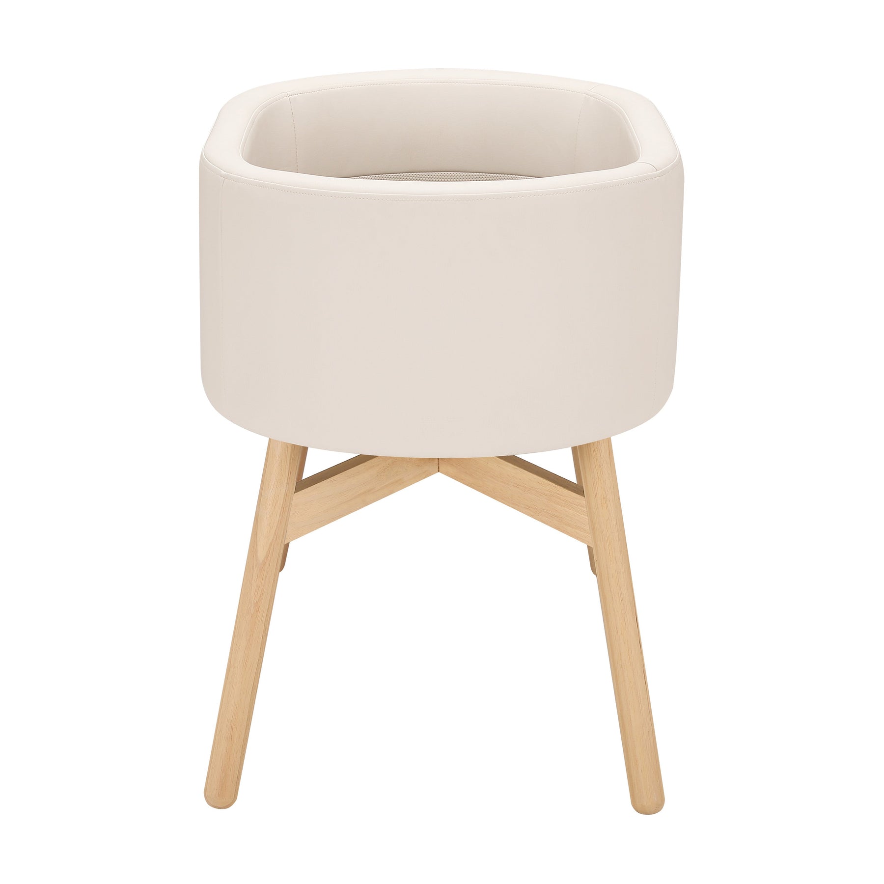 CLEAN, MODERN AESTHETIC: Playful, rounded, rubberwood legs complement a sleek, capsule-shaped basket upholstered in Gathre’s signature bonded vegan leather.