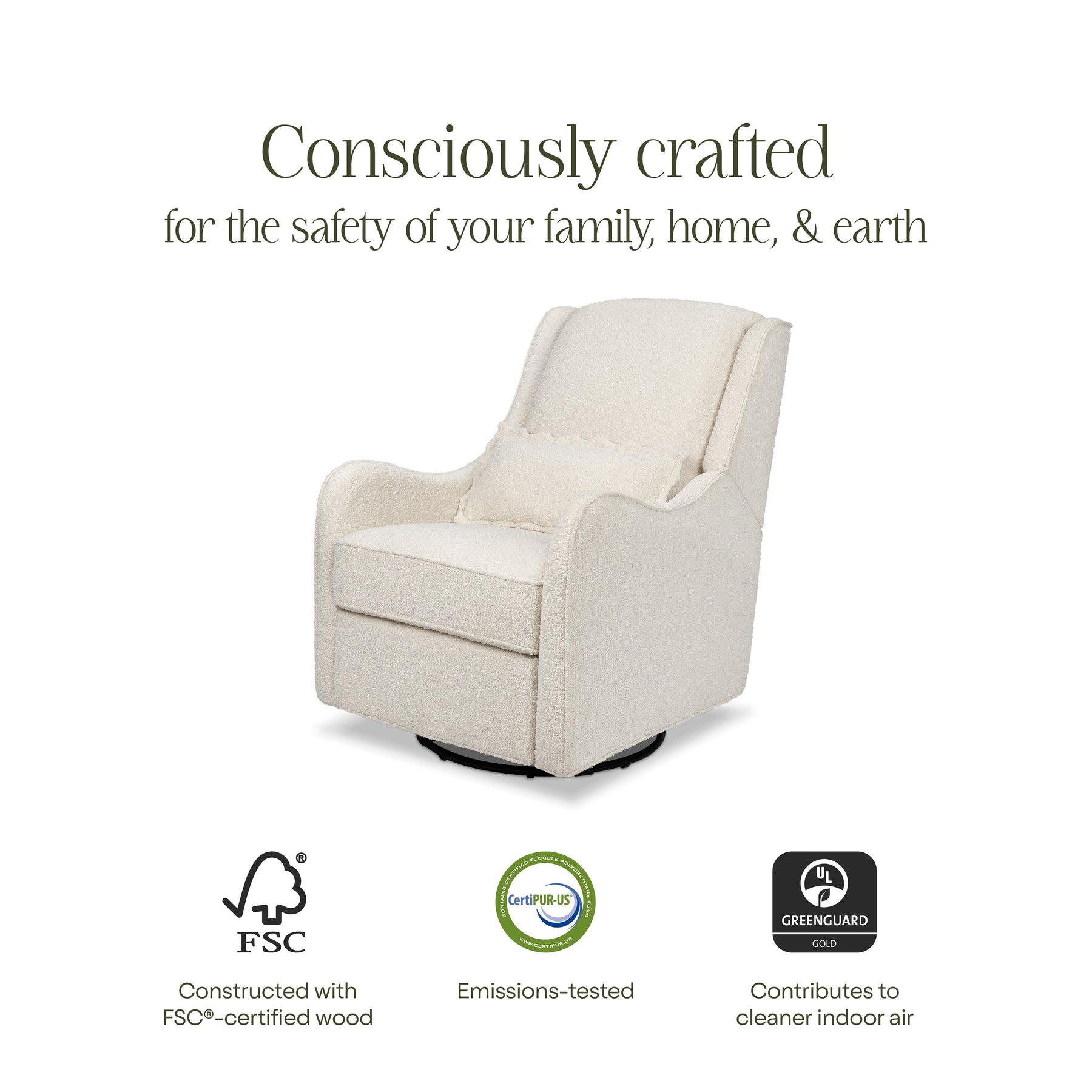 BREATHE EASY: Foam used in the seat meets all CA TB117-2013 flammability requirements and is CertiPUR-US® certified, certifying the foam is made without PBDE or Tris flame retardants, heavy metals, formaldehyde, CFCs and phthalates regulated by the CPSC. FSC® CERTIFIED WOOD: Wood used in the frame of this product comes from well-managed, FSC®-certified forests. The FSC® label means that wood has been harvested to benefit communities, wildlife, and the environment.