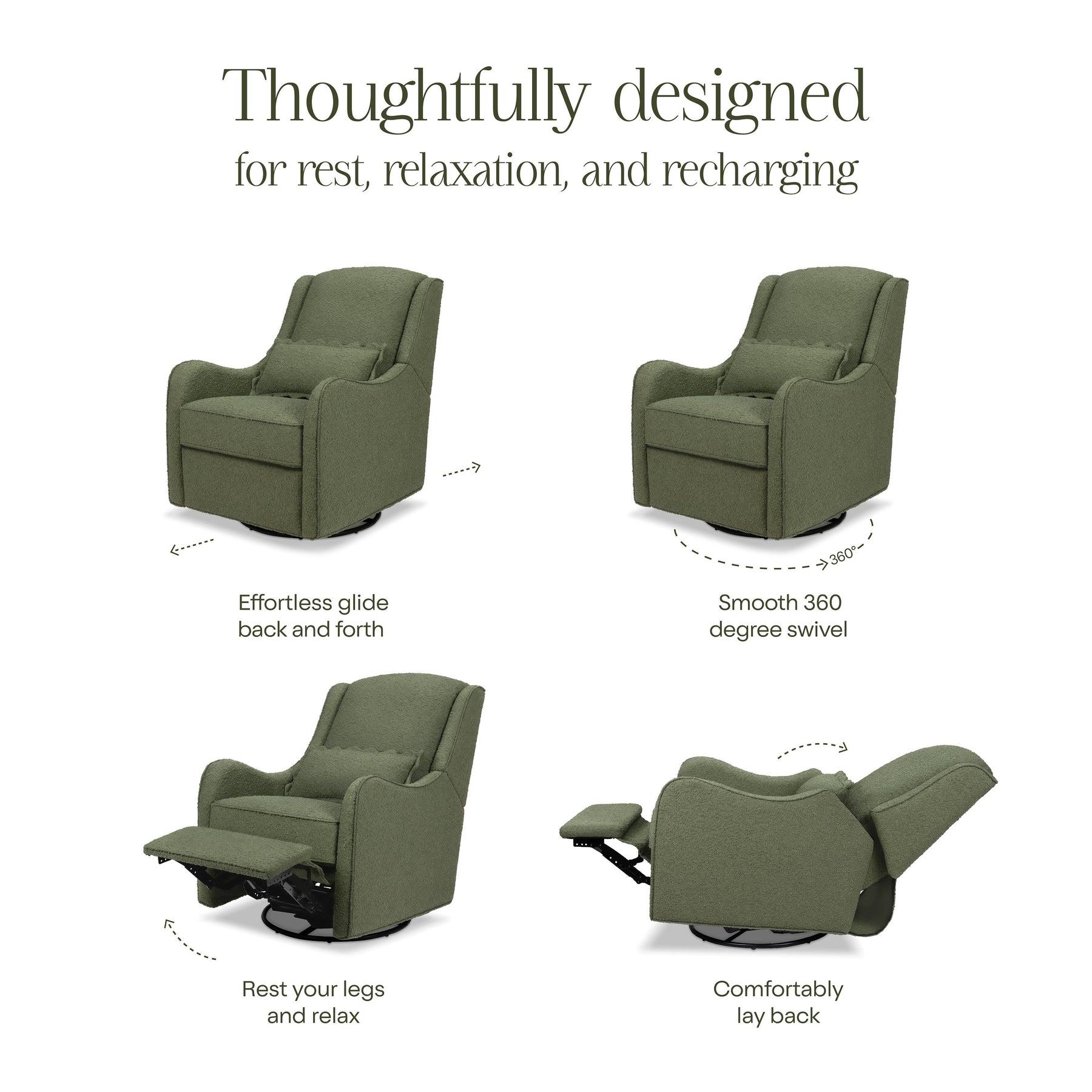 EASY RECLINE & EFFORTLESS GLIDE: Cuddle up, recline, and get cozy. Our hidden reclining mechanism maintains a clean design while offering traditional comfort. Whether you are feeding baby or rocking baby to sleep, our metal base allows for a smooth and gentle 360 degree swivel motion as well as forward and backward gliding.