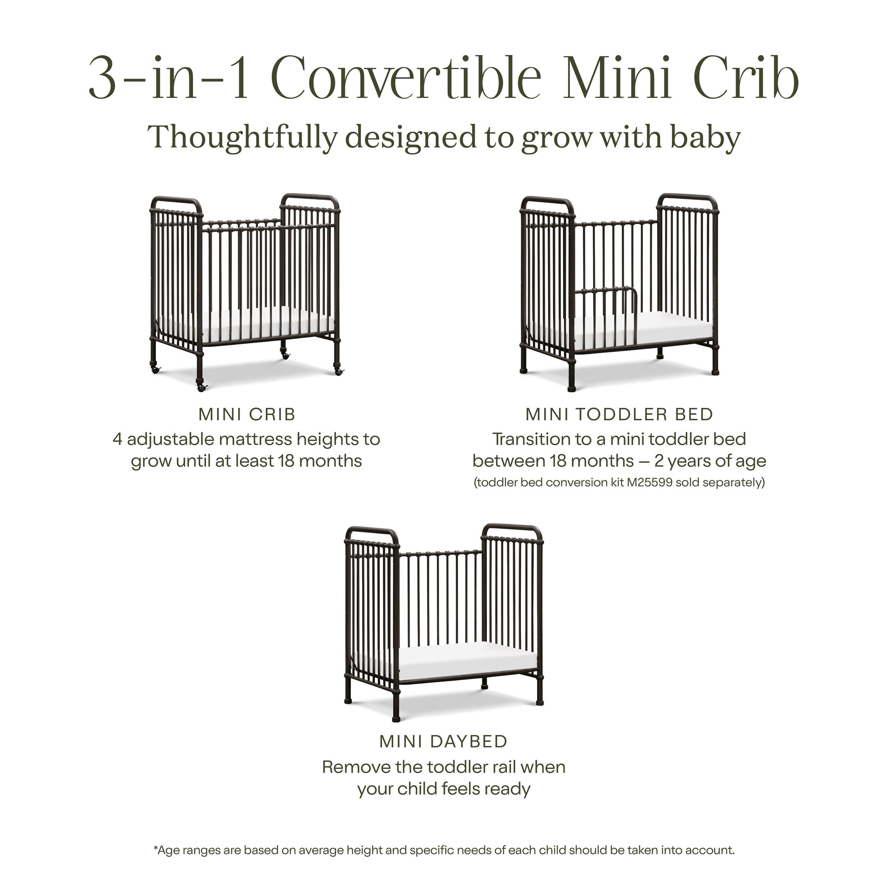Our best-selling Abigail Crib has been reimagined for small spaces – perfect for nursery nooks, shared bedrooms, and grandma's guest room. It's a smart alternative to a bassinet that will last longer and convert to a toddler bed and daybed as your little one grows. The Abigail 3-in-1 Convertible Mini Crib features a portable design with removable casters, premium steel and traditional metal casting at the joints to emulate vintage American style.