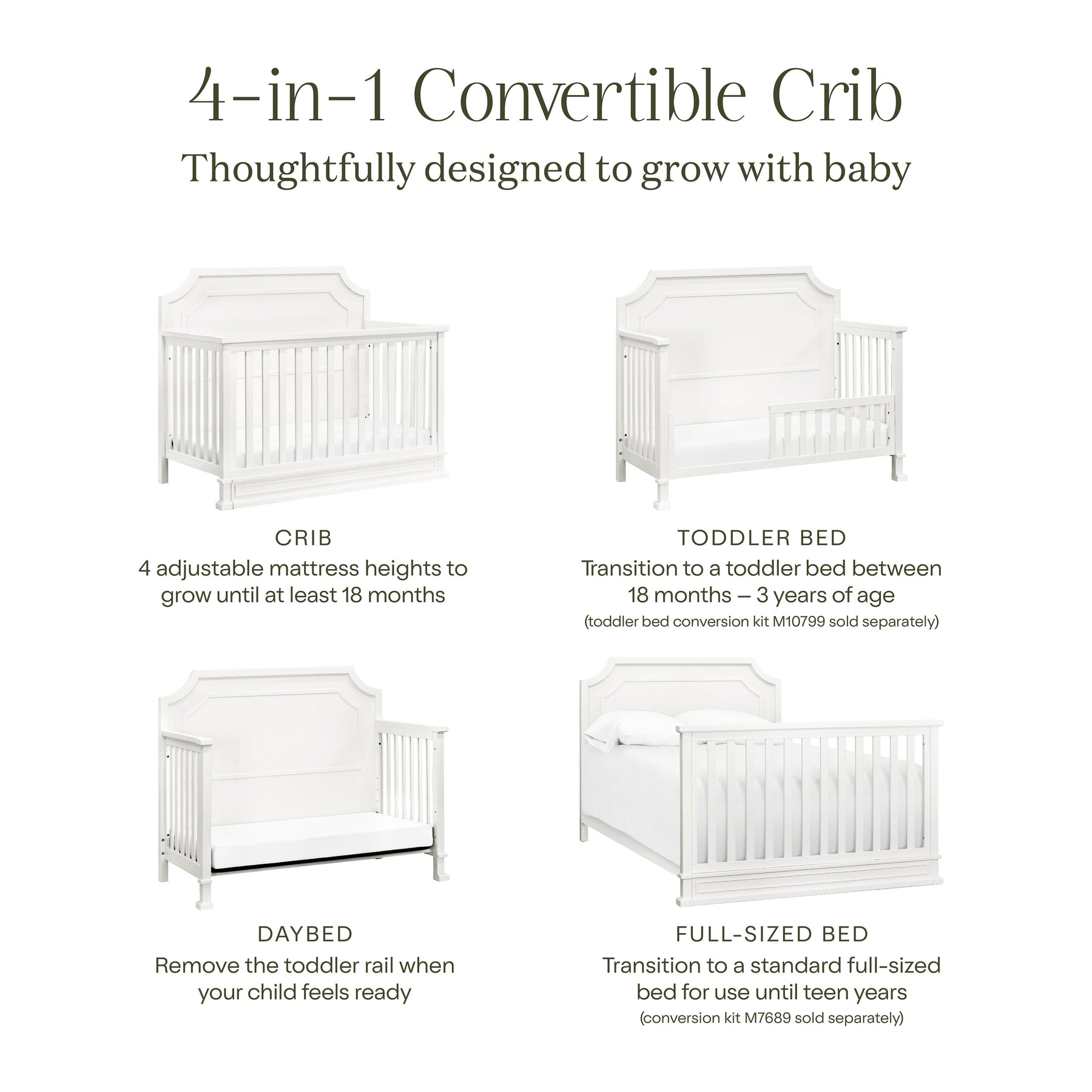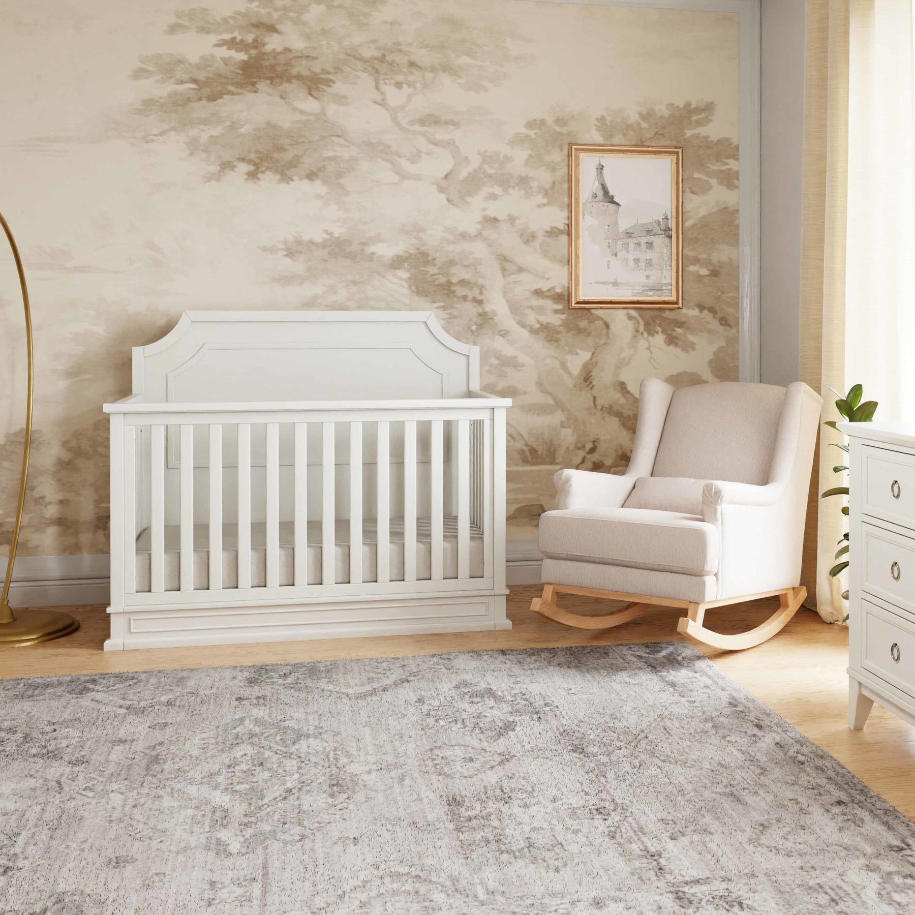 An heirloom inspired piece that exudes the glamour of Hollywood’s iconic golden age and the romance of classic architecture detailing, The Emma Regency 4-in-1 Crib is the perfect focal point in any classic nursery. The stylish Emma features a bold geometric headboard with crescent cut detailing and a flush crib front for a dramatic presence. This sumptuous crib converts to a toddler bed, daybed, and full-size bed.