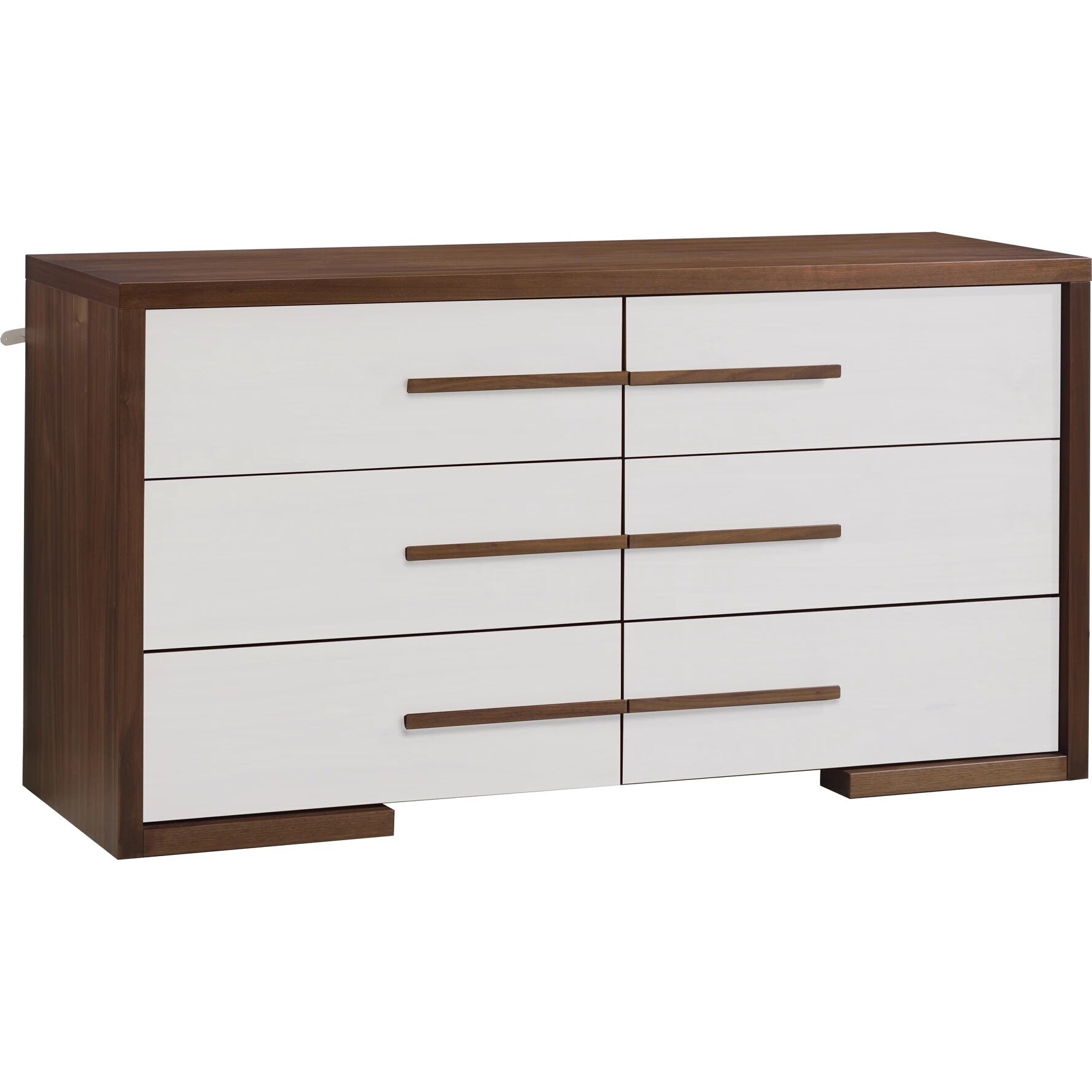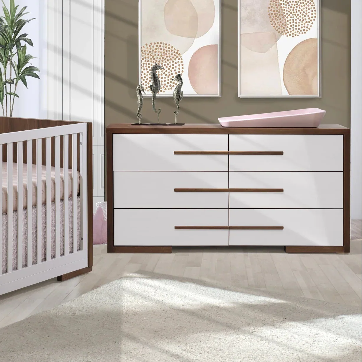 The Aria collection is a modern design, made of walnut wood, features a rich, brown wood grain that is naturally beautiful and offers a unique nursery look. The cribs and dressers are available in two-tone combinations with custom made walnut wood handles.